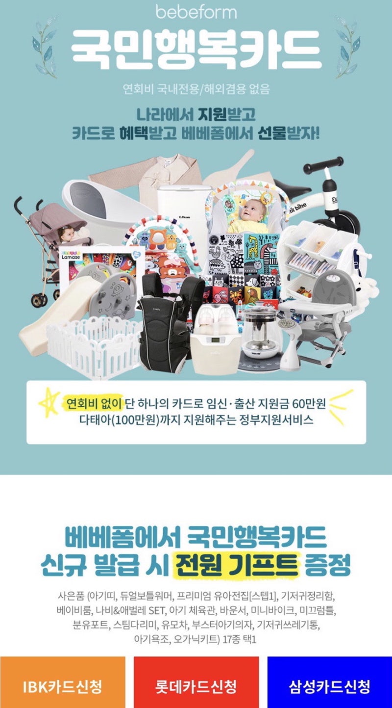 솔직히 제가 막내 임신 후 임산부 혜택을 받기 위해서 국민행복카드를 발급받았을 때는 은행에 가서 바로 하고 아무 사은품 없이 임신 바우처만 받았는데요.베베폼을 통해 신청하면 헉…! 국민행복카드 사은품이 아기띠, 카시트, 역류방지쿠션 등 국민육아아이템이 사은품으로 선택할 수 있거든요.무엇보다 어린이집 결제를 위해 재발급 또는 발급받는 경우 역시 장남을 위한 장난감이나 필요용품도 골고루 있기 때문에 선택의 폭이 굉장히 넓습니다.