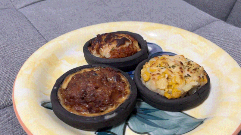 안에는 다양한 지역 특산 빵들이 있는데 춘천은 스테이크 구이로 유명한 곳이라 맛이 궁금하다. 검은 테이블 위에 춘천 스테이크와 각종 재료들이 가지런히 놓여 있다. 흑빵 부분은 철판구이 닭갈비 팬인데 알고보니 철판구이 닭갈비 등장 이후에 만든 것 같아요!