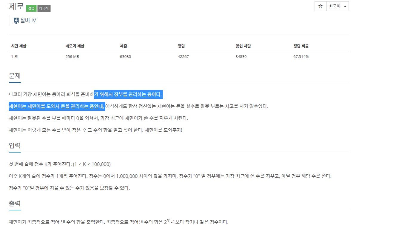 정수 K는 첫 번째 줄에 제공됩니다. (1 ≤ K ≤ 100,000) 이후에는 K 행 각각에 정수가 지정됩니다. 정수는 0에서 1 000 000 사이의 값을 가집니다. 정수가 “0”이면 마지막으로 쓰여진 숫자가 삭제됩니다.