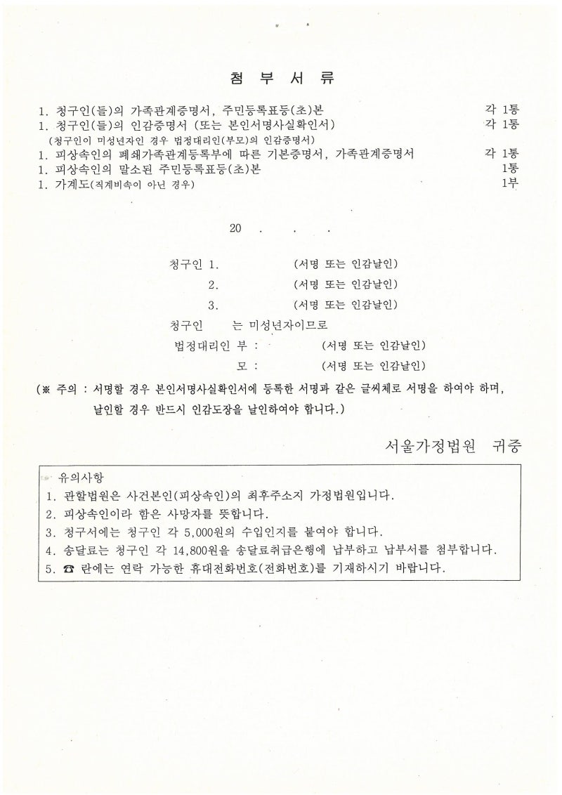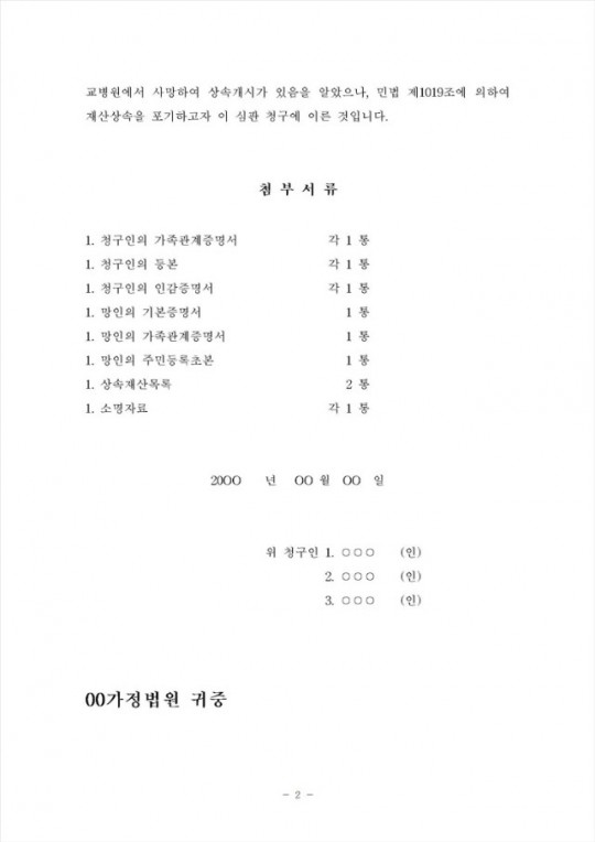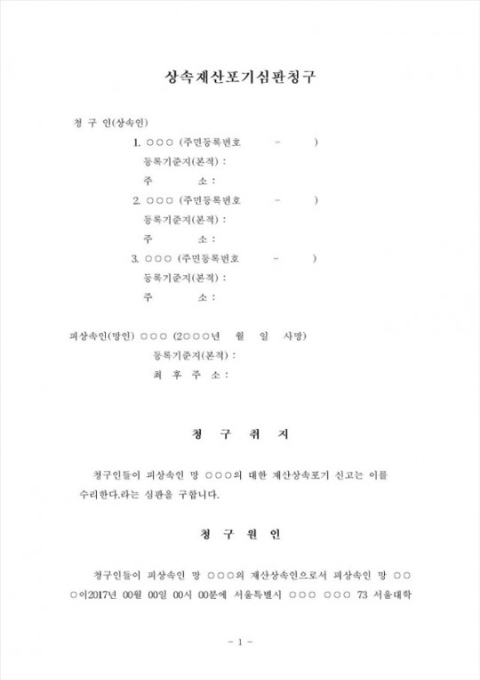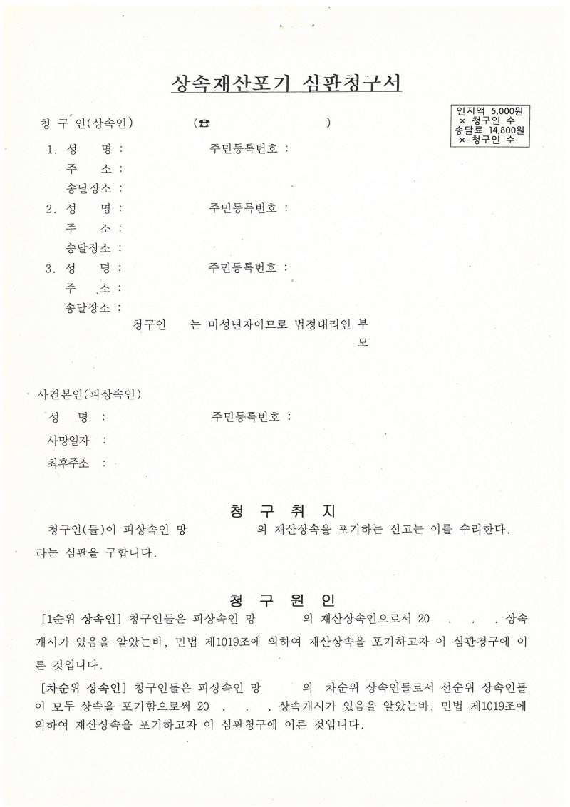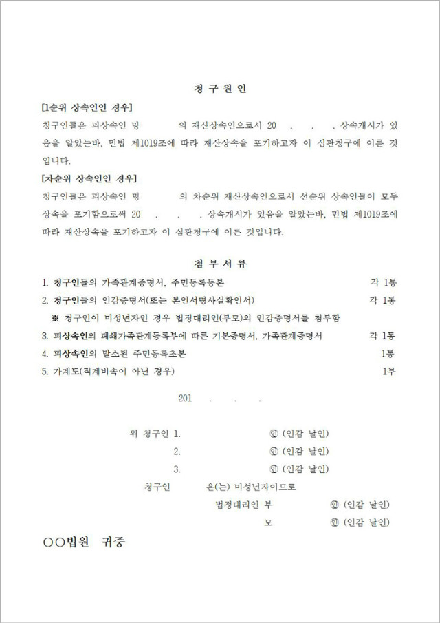 본 제도는 돌아가신 분이 남긴 재산과 부채를 모두 승계하지 않겠다는 의사를 나타내는 것으로 사망일로부터 3개월 이내에 가정법원에 신고하시기 바랍니다.이를 위해 가장 필요한 서류 중 하나는 상속포기심판청구서이며, 이는 문자 그대로 유산포기에 대한 심판을 요구할 목적으로 기재하는 문서이며, 여기에 들어갈 항목은 청구인과 고인의 인적사항, 청구취지와 원인, 날짜 등이며, 필요에 따라 관련 서류를 첨부하기도 합니다.이것을 다 쓰면 작성자의 서명과 날인을 하게 됩니다. 이외에도 준비해야 할 서류는 고인의 기본증명서와 가족관계증명서, 주민등록초본이 필요하며, 그리고 신청인의 기본증명서, 가족관계증명서, 주민등록초본과 인감 및 인감증명서가 준비되어야 합니다.이런 것들을 정해진 기간 내에 빠짐없이 제출해야 문제없이 법원이 서면을 심사하고 판결을 내리게 됩니다.