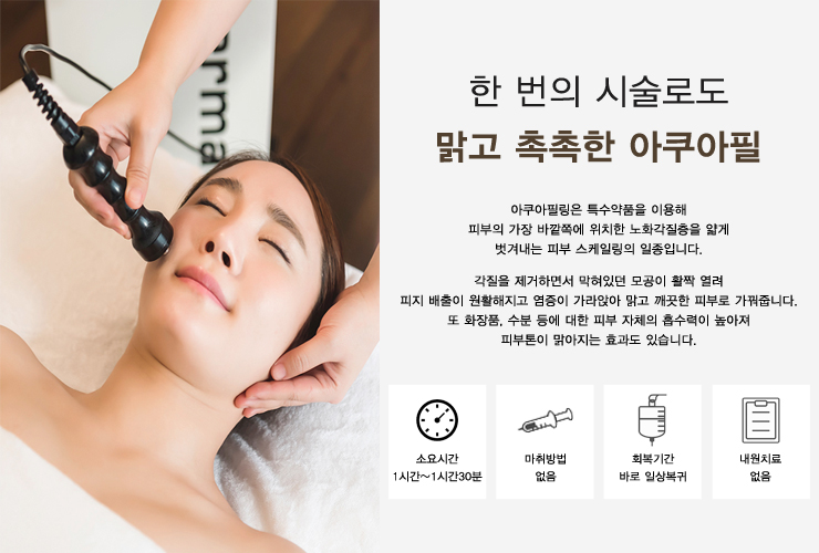 아쿠아필은 시계방향으로 회전하는 칩을 이용해 모공 속에 AHA 성분을 투입합니다. 이 과정에서 여드름 발생 요인으로 꼽히는 모낭충을 함께 제거할 수 있고, 깨끗해진 모공 속에 고농축 하이드로 에센스로 수분과 영양분을 공급하는 과정이 끝납니다.아무래도 세종피부과에서 고민할 때 통증도 거의 없는 아쿠아필로 추천하는 sejong creamy는 부작용이 거의 없고 피부결 개선과 탄력 증가는 물론 피부가 반짝이는 것처럼 윤기나는 세종 아쿠아필을 추천합니다.