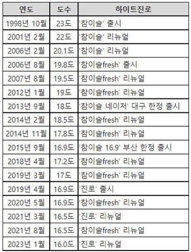 위의 표를 보면 우리나라 대표 소주인 참이슬의 도수 변화를 알 수 있다. 1998년 이후로 꾸준히 떨어지고 있으며 현재는 약 16도입니다.