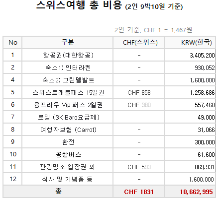 5 박 6 일 여행 스위스 여행 비용