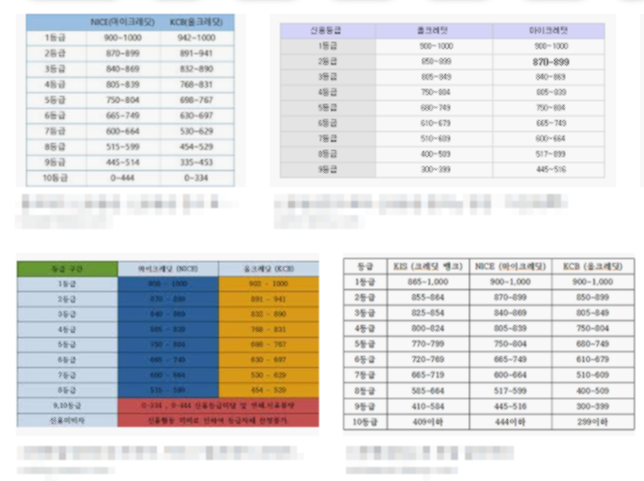 물론 참고 정도는 할 수 있다. 하지만 그런 정확하지 않은 정보로 내가 그 등급에 있다고 무조건 되는 것은 아니기 때문에 큰 의미는 없다고 생각한다. 그 시간에 좀 더 알아보고 조건이 좋거나 가능성이 있는 곳을 찾아보면 어떨까 싶다. 굳이 확인하고 싶다면 요즘 많은 곳에서 정말 쉽게 등급 정도를 확인할 수 있는 서비스를 하고 있으니 참고하자. 어쨌든 오늘 하고 싶었던 말은 신용등급 점수표보다는 어떻게 관리할지 찾거나 다양한 곳을 직접 확인하는 게 낫다는 얘기다. 상황이 안 좋은 분들이 대부분인 것 같아. 이런 정확한 출처도 없는 표를 보는 것보다는 직접 업체나 금융기관에 물어보는 것이 훨씬 유익한 정보를 얻을 수 있다고 생각한다.