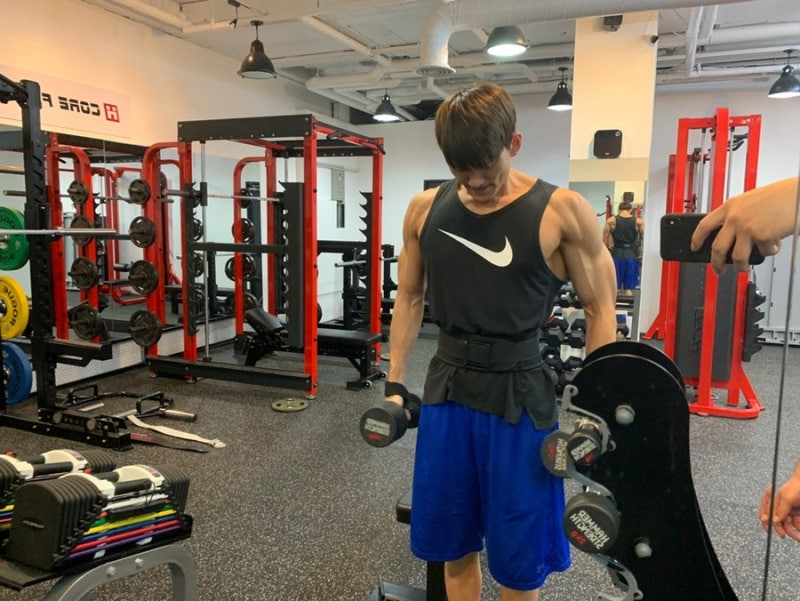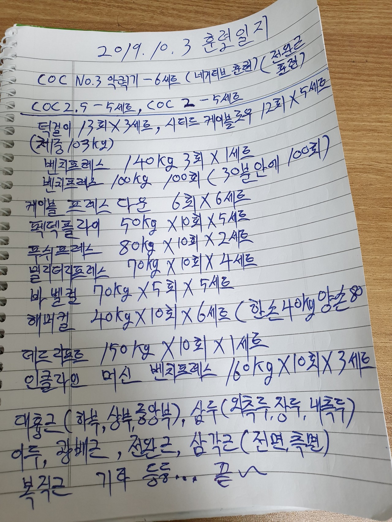 (4) 팔 근력 강화 동작 : 바벨 컬 6~8회 X 5그룹(휴식 2분) 해머컬 12회 X 5그룹 덤벨 오버헤드 익스텐션 8~12회 X 5그룹(휴식 1~2분) 로프 프레스 다운 8~12회 X 5그룹 (휴식 1~2분)