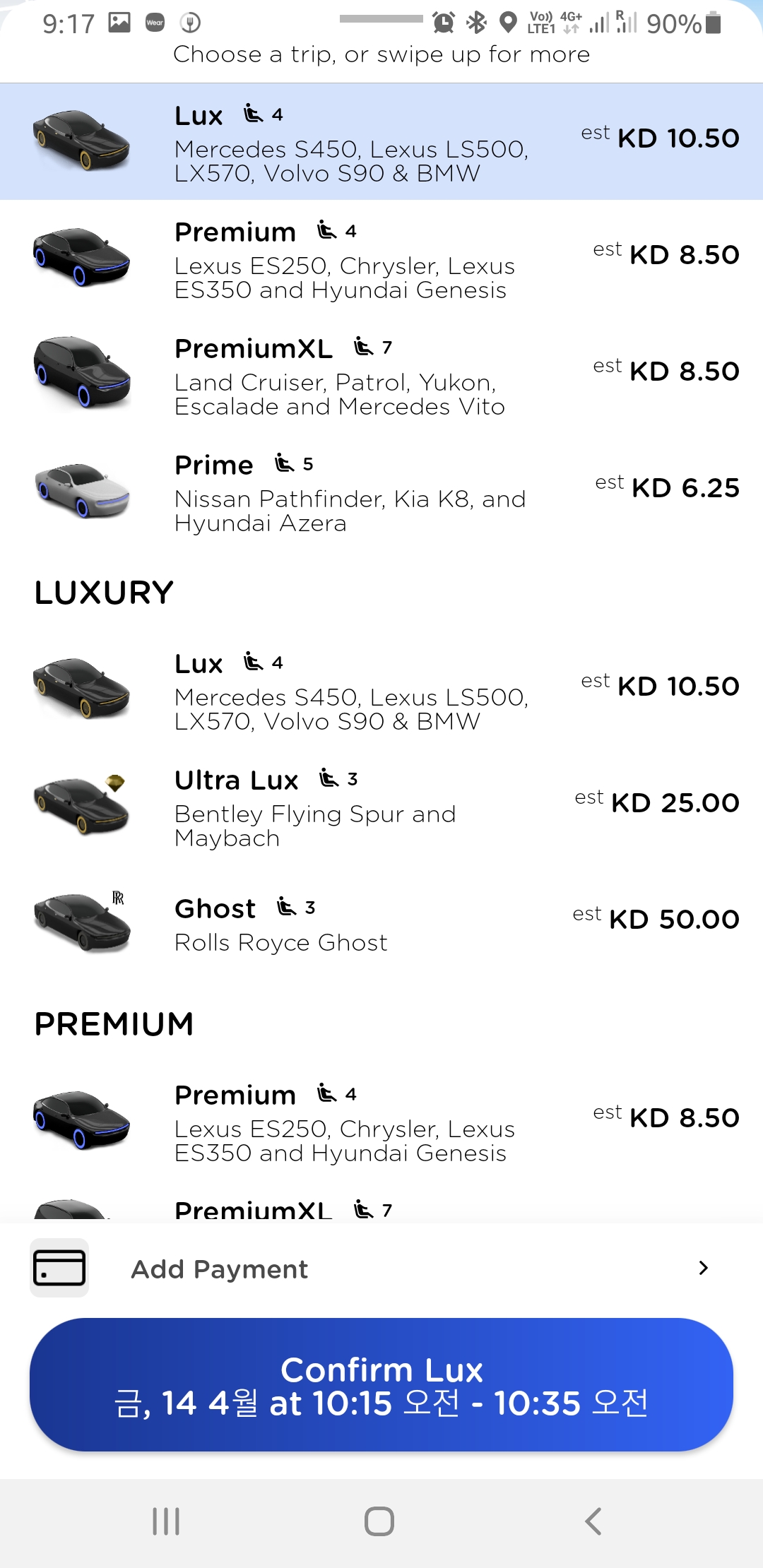 선택할 수 있는 차량의 범위는 Grand Limo보다 훨씬 넓습니다. 롤스로이스 고스트 외에도 마이바흐, 벤틀리, 메르세데스 등 다양한 차량을 선택할 수 있다. 공항에 가기 위해 롤스로이스를 부르면 50KD, 약 21만원이 든다. 그랜드리모와 동급 풀사이즈 SUV를 부르면 공항까지 8.5천원이 들어 그랜드리모보다 조금 더 저렴하게 이용할 수 있다.