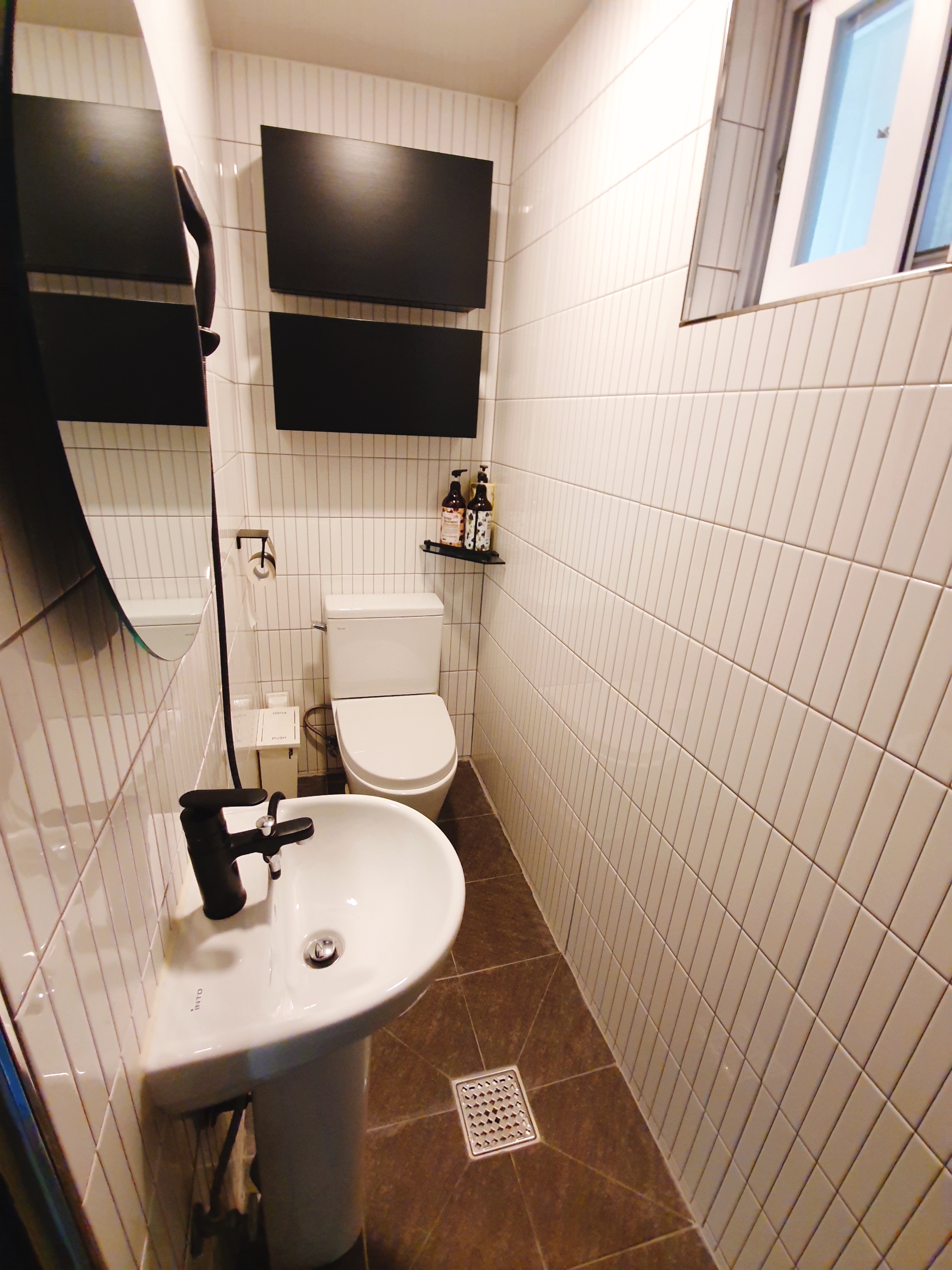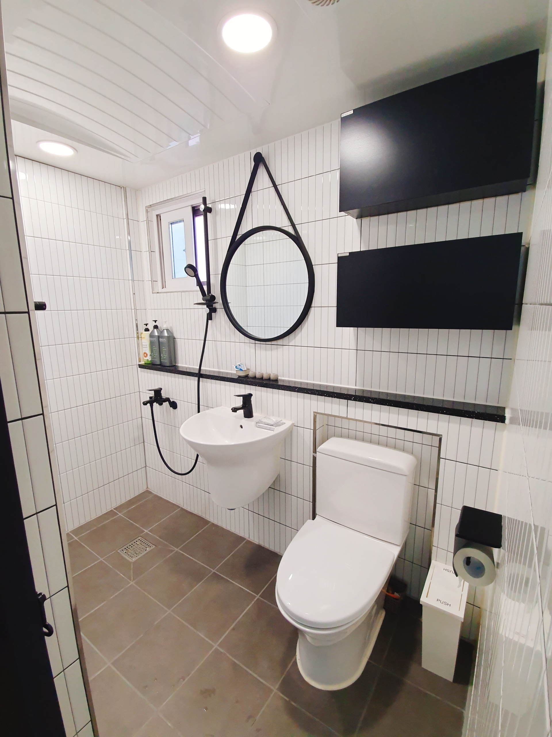 샤워하기에는 약간 비좁습니다. 그래도 안방에서 잘때 화장실 가는게 너무 편했어요.