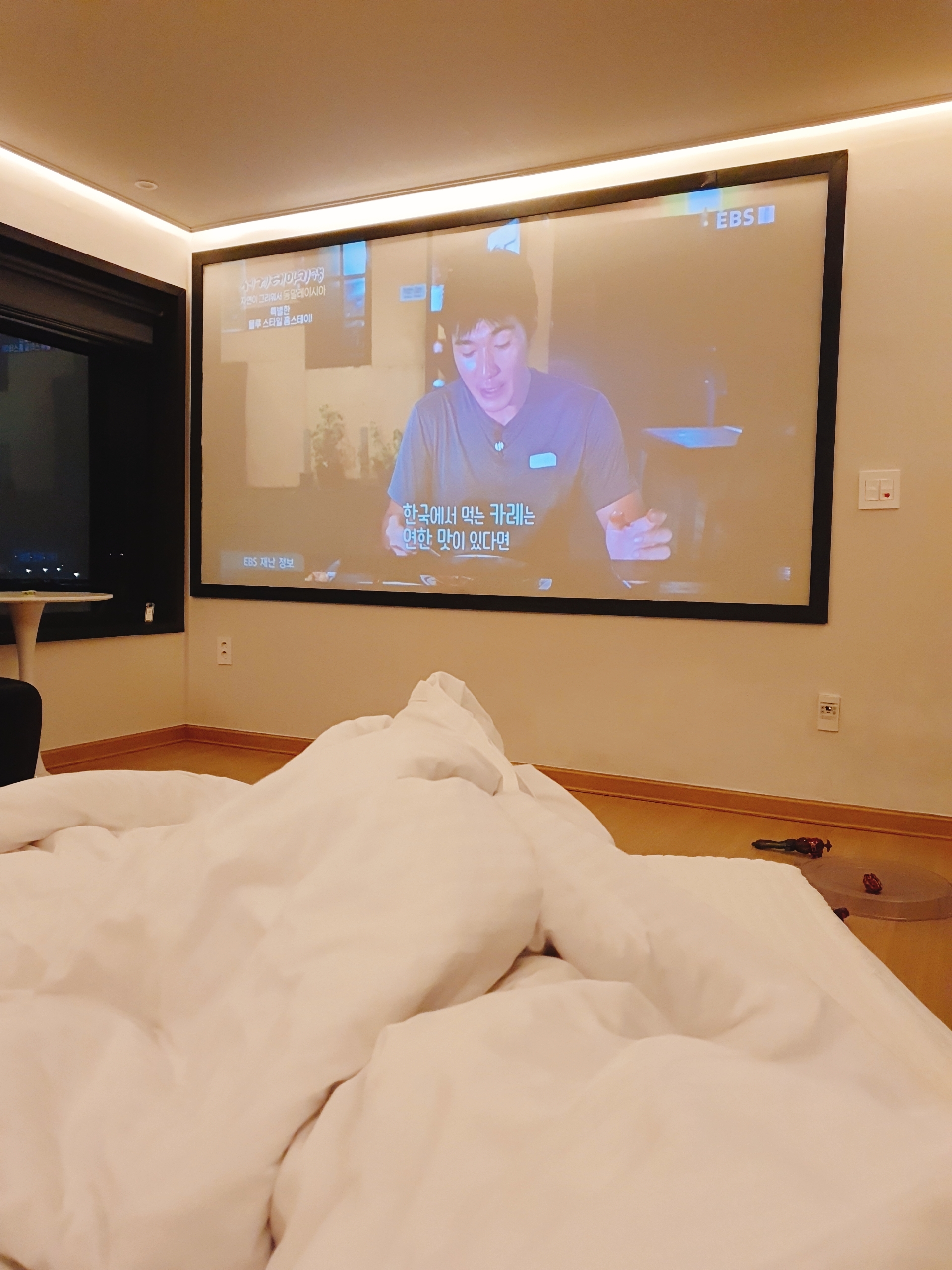TV는 빔프로젝터라 낮에 보려면 불을 모두 꺼야 합니다.