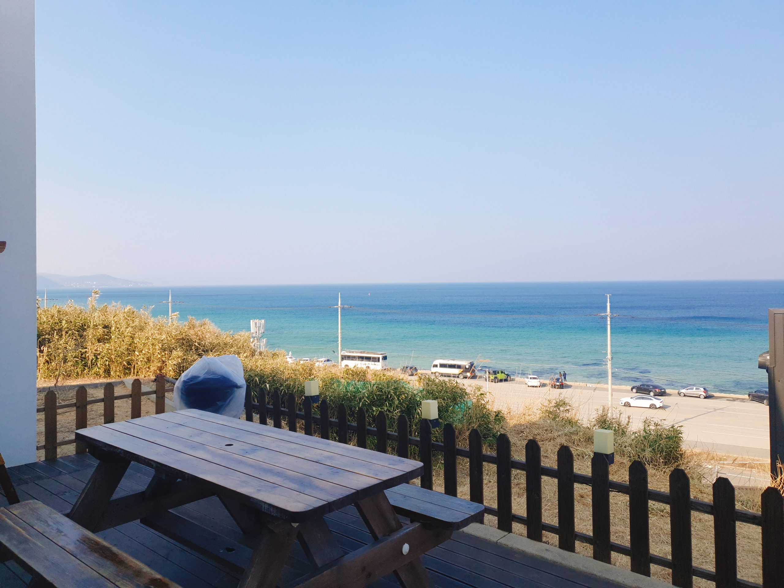 커피 한잔과 함께 테이블에 앉아 바다를 바라보는 것도 좋지 않을까요?