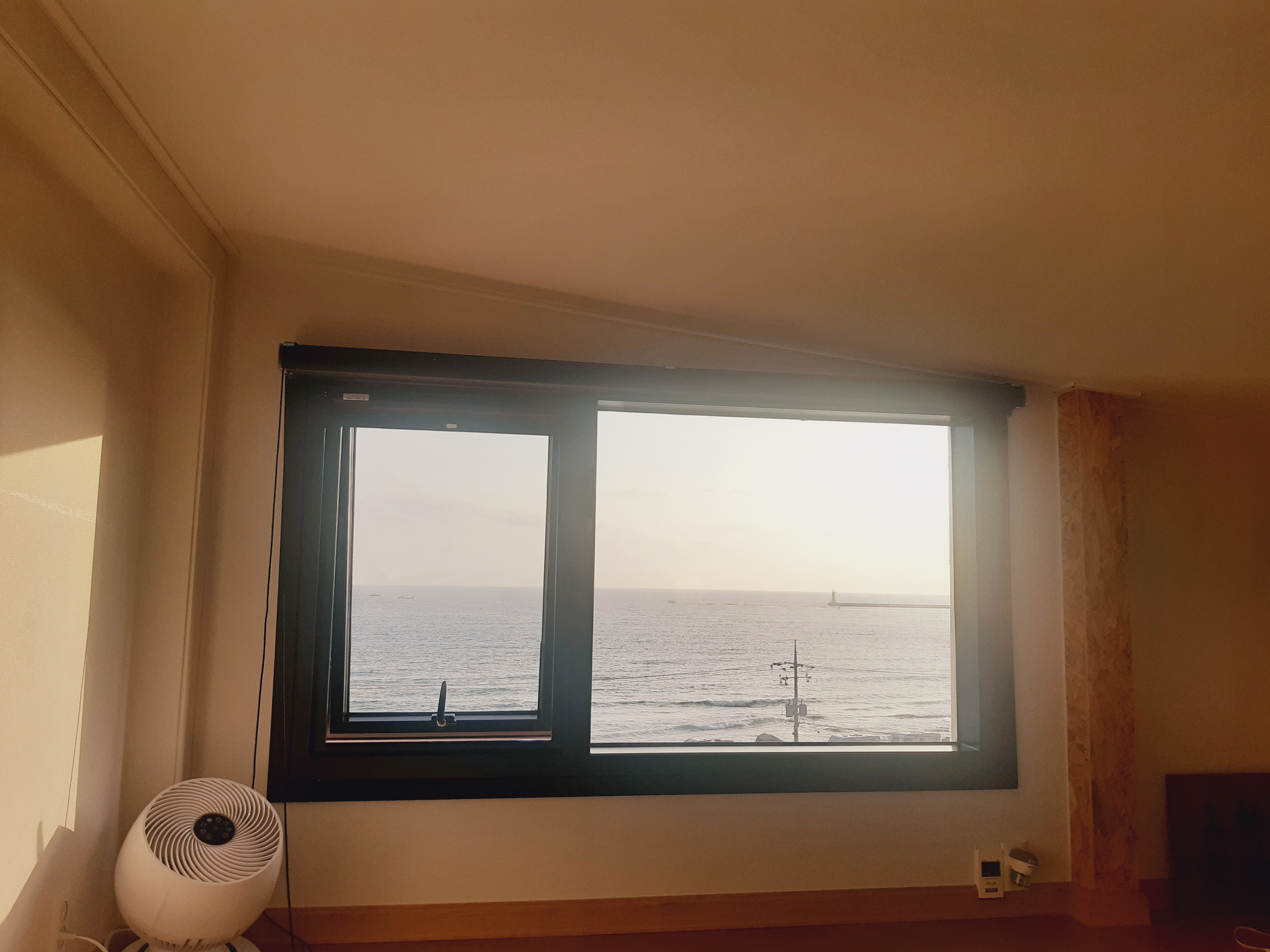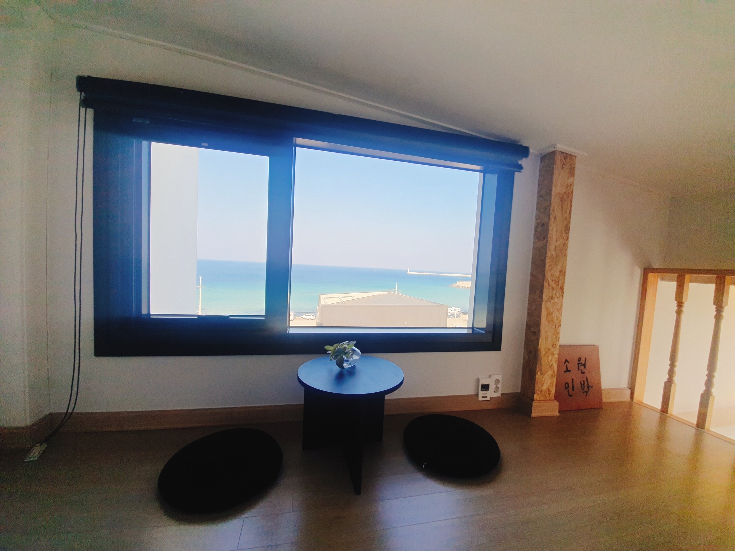 2층 창문으로 바다가 보입니다.