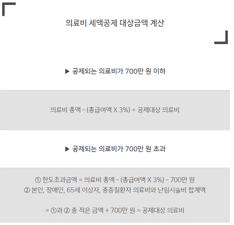 종합세액계산 흐름도를 보면 기본적으로 고소득자는 과세표준을 낮추어 소득감면에 유리하고, 상대적으로 저소득자는 세액공제 자체를 줄이는 데 유리하다. 소득공제에는 인적공제, 연금공제, 이자비용 등이 있고, 세액공제에는 교육비, 기부금, 의료비 등이 있으며 이에 대해서는 아래에서 자세히 다루도록 하겠습니다. 소득세율은 연 4600만~8800만원이며, 세율은 24%(지방세 포함 시 26.4%)다. 누진공제금액은 522만원이다. 즉, 연봉이 8000만원이면 납부해야 할 소득세는 1590만원이다. 그래서 세금을 낮추기 위해 다양한 소득공제와 세액공제를 도입해야 합니다. 연말정산 의료비공제(총진료비-(총급여×3%))×15%, 즉 총급여의 3%를 초과하는 부분만 공제한다. 예) 연봉 5,000만원/의료비 500만원 = 350만원 x 15% 공제 : 525,000원 의료비 세액공제 (출처: 국세청) 의료비 공제① 의료기관이 지급한 의료비(자동 반영) 국세청) ② 장애인보조기구 및 의료기기(영수증 별도 첨부) ③ 안경/콘택트렌즈(50만원)(영수증 별도 첨부) 필요) ④ 보청기, 산후조리원 이용료(영수증은 별도 영수증 필수) 별첨) 출처 : 성형/성형외과 및 국외에서 지출한 비용을 제외한 국세청에서 발생한 모든 비용 공제 가능. 아! 또한 보험사가 실제 의료비 손실을 지급한 경우에는 공제 범위에 포함되지 않습니다. 일반적으로 의료기관(병원/약국)의 경우 납부내역을 국세청에 신고하기 때문에 자동으로 차감되어 컴퓨터에 반영됩니다. 단, 진료장비, 안경, 콘택트렌즈, 산후조리원 비용(총 급여 7천만원 이하)은 자동 반영되지 않아 연말정산 영수증을 첨부하고 틀니, 틀니, 스케일링 등을 받아야 함 , 의료용 치열 교정 등 면세 가능! 반드시 잘 챙겨 드세요(건강기능식품은 공제 불가). 의료비는 인적공제 대상이 아니더라도 공제가 가능합니다. ) 남편이 사업소득이 있으면 아내의 의료비를 공제할 수 있고, 부모가 소득이 있으면 연말정산을 하게 되는데, 이 경우 자녀가 부모에게 실제로 지급하는 경우에 한해 자녀가 의료비를 공제할 수 있다. ‘ 의료 비용. 부모님 카드로 결제를 하셔도 자녀가 카드결제를 하셨거나, 부모님을 부양하면 공제받을 수 있어요! 큰아들이 인적공제를 하고 차남이 의료비를 낸다면 가장 많이 받는 질문인데 어떤 자녀가 의료비공제를 받을 수 있나요? 즉, 피부양자가 장남이고 차남이 부담하면 어느 쪽도 공제 대상에 포함되지 않는다. 실손의료보험 관련 Q&A ① 실손보험 접수내역은 어떻게 확인하나요? : 홈택스 -> 의료보험급여 실질상실 ② 의료비 20년 후, 21년 의료비를 납부하는 경우 : 21년 의료비에서 공제(20년간 공제) 불가하지만 이 경우에는 집에서 이혼의료보험세 납부 여부를 확인할 수 있으며, 20년에 의료비를 내고 21년에 의료비를 받았다면 21년에 공제됩니다. 즉, 20년간 의료비 공제가 가능하다는 것! 21년말 세금통관을 위한 의료비 공제 문제에 대해 공부해 봤습니다. 도움이 되셨기를 바라며 감면하겠습니다. 감사합니다 ^^ 연말청산소득공제 관련글(~참고하세요~) 20년간 연말청산소득공제(ft.개인공제, 신용카드공제 등) 이제 찬바람이 불고 한해가 -세금계산서가 생각나네요^^;아내가 세금사고 전 회사원이라 늘 이 계절이 좋아요… blog.naver.com