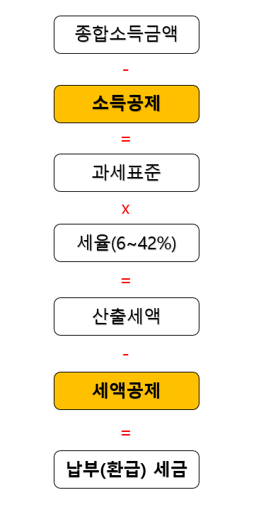 상기 간이과세표(국세청 자료)에 따라 매월 세금을 납부하고 다음해 3월 10일 이전에 연말정산을 실시하여 실제 납부할 세액을 정확히 산정한 후 납부세액을 비교 간소화된 세금 양식으로 전환 세금 환급 또는 추가 지불을 받으십시오. 연말에 세금환급을 받기 위해서는 가장 중요한 것이 소득공제와 세액공제를 동시에 받고 결정세액을 줄이는 것입니다. 소득공제: 과세표준 축소(소득금액 축소) 세액공제: 세액 축소(세액 자체 축소)